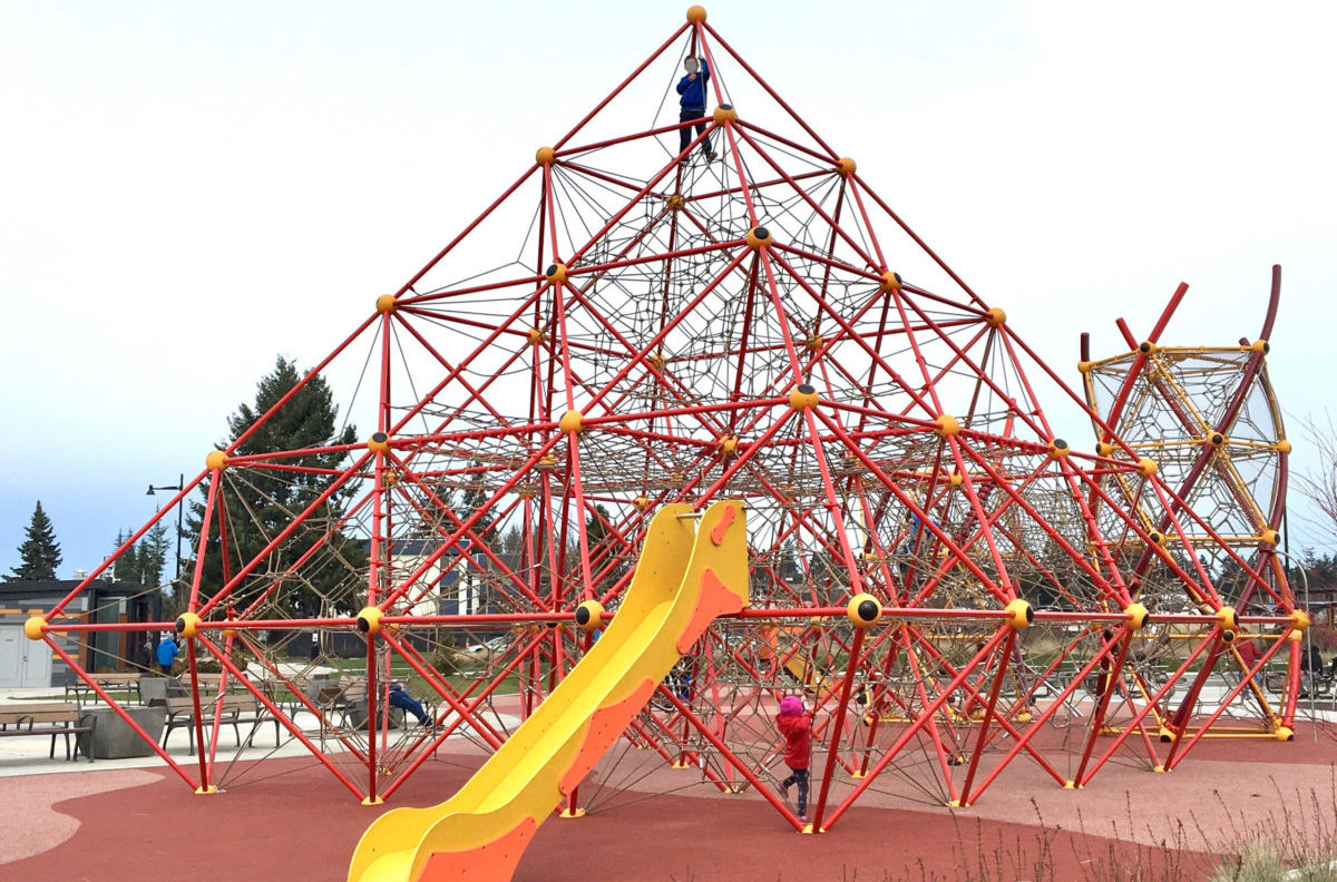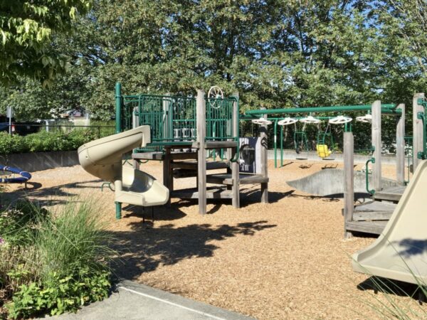 This park and library combination can’t be beat for an easy outing. They are steps away from each other, share a parking lot and have a transit stop, out front. The park is very manageable, with a few types of play structures and tandem swings (flat seat and bucket swing). The library has a good-sized children’s section, including books in several languages. Snack options are limited, although the Kraken Community Iceplex and Northgate Mall are across the street and have eateries with various food choices.