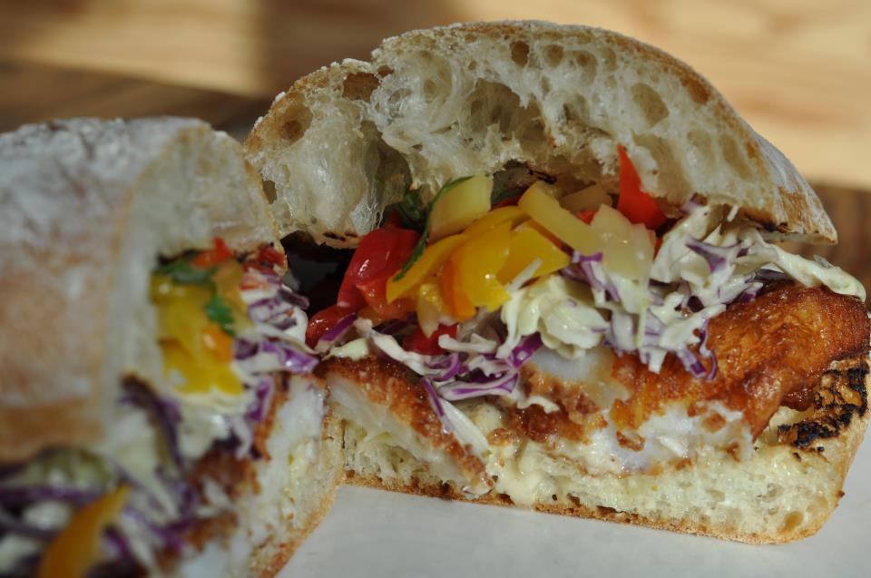 Beer-battered cod tortas with pickled chilies & habanero slaw.