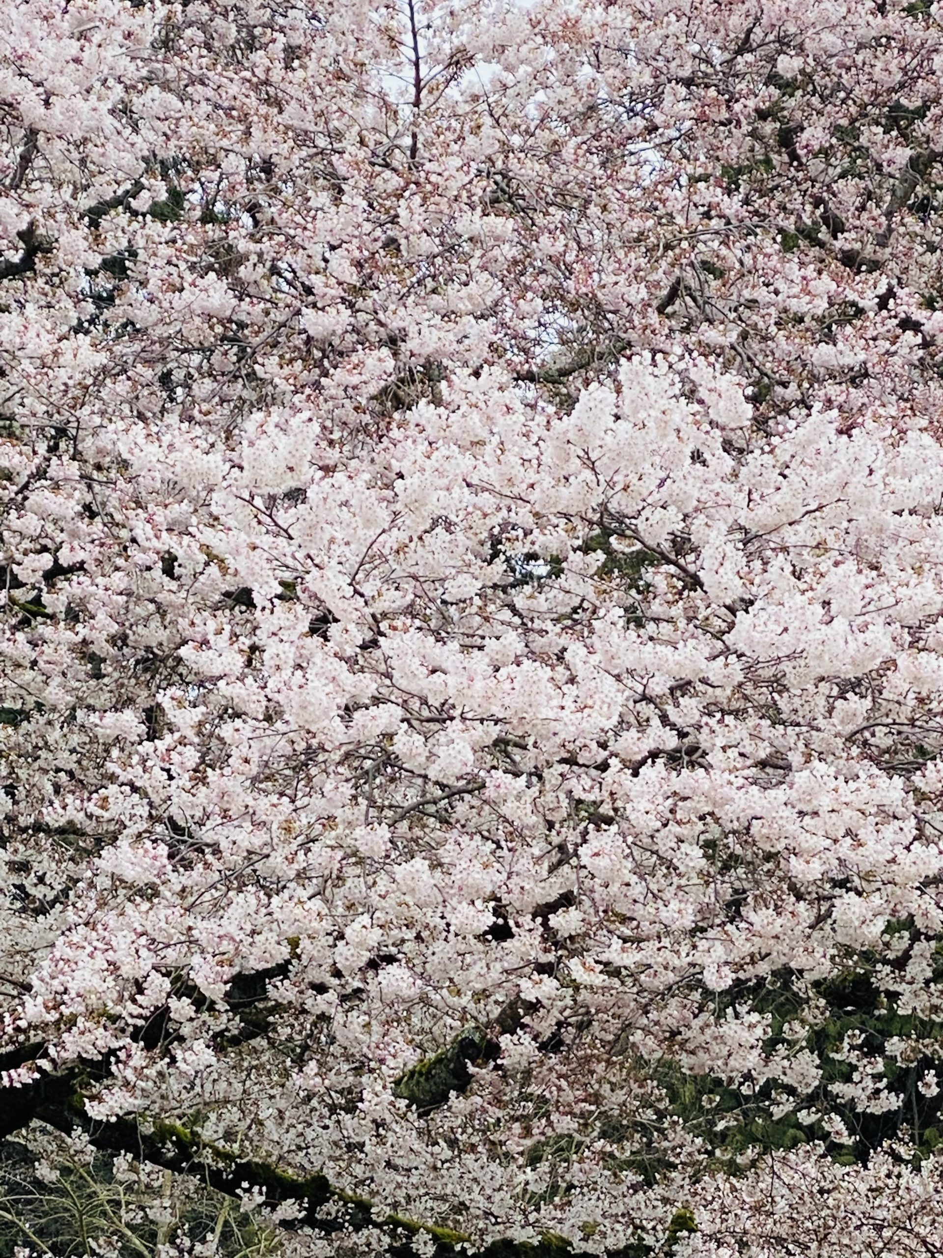 Looking up at cherry blossoms branched, intertwined