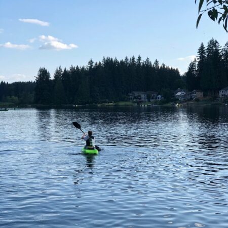 A local favorite, Cottage Lake Park is home to a small circular lake surrounded by beautiful homes. With public lake access, it’s easy to bring your own kayak or SUP and enter the waters to the right of the dock. Float past the ducks and to the middle of the lake. Follow the perimeter or go from end to end. A small outlet to the east of the lake is covered with lily pads. Admire the yellow and purple flowers, but don’t get stuck. The roots of the pads are long and run deep into the water. Watch for fishing lines near the dock and kids jumping off to swim as well. Enjoy the peaceful and calm waters further out from the bustling crowds. Be sure to wear a hat and sunscreen, there are few places to rest under shade. Look up and you may see resident eagles flying above or diving into the water for a feast of fish.