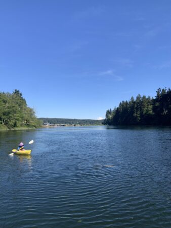 Another great saltwater option, the Purdy Spit offers an easy-to-access body of water suitable for kids on lower-wind days. Kids might enjoy the challenge of crossing Henderson Bay or paddling under the bridge to Burely Lagoon at higher tide. If the wind rises further out in the Bay, you may enjoy watching local windsurfers.