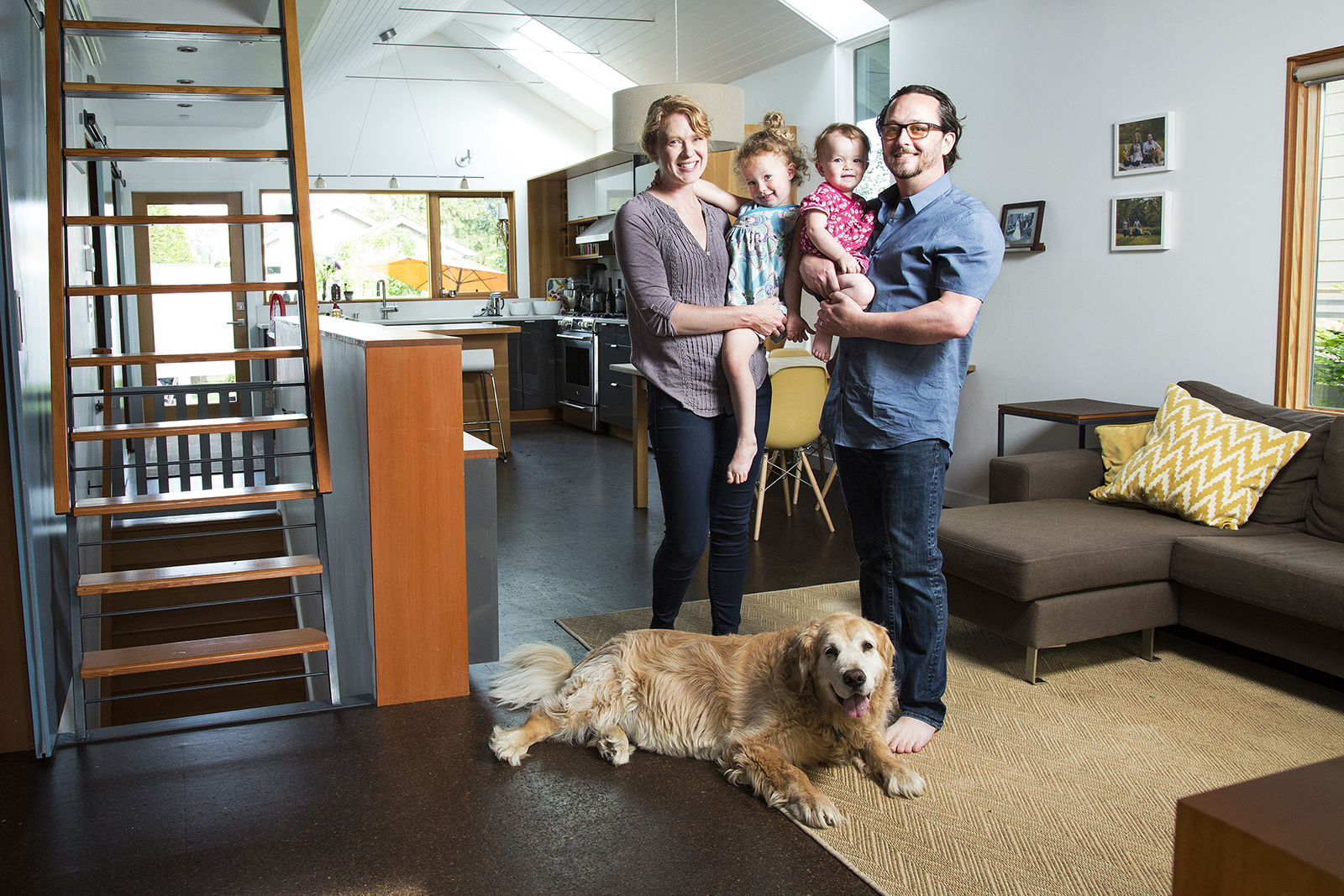 During the remodel, the Zerbeys were able to add several stylish-looking safety elements with their little ones in mind, including a customized wooden baby gate, plus built-in bookcases and furniture for safety. The couple finds it challenging to keep rambunctious kids off of that tempting loft ladder to the upstairs office — and who could blame them? “Our kiddos aren’t allowed on the loft ladder — one of the ground rules that we’ve had a harder time enforcing with our 1½-year-old — but we both realize that at some point that space will likely become their hideaway zone,” Lauren says.