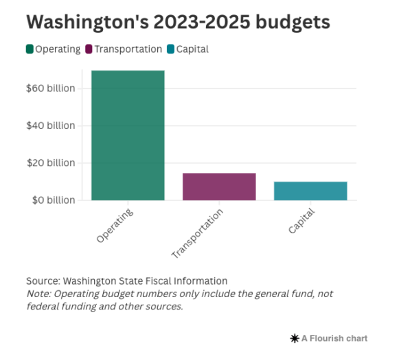 In the operating budget, the majority of money goes toward K-12 schools. The second highest share is for human services — things like child care subsidies, long-term care providers, food assistance, mental health support and services for those with developmental disabilities. The next big bucket is for Washington’s four-year colleges and universities and two-year community and technical colleges. Then, there’s the “general government” category, which includes funding for emergency management, tax collection, and housing and economic development programs.