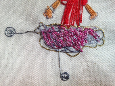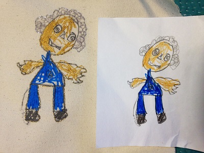 “One thing I like about kids’ drawings is there’s so much decision-making that goes into them,” Zwick explains, “By translating them into embroidery, I’m calling attention to all those decisions in really specific ways. Embroidery anchors things that seem really casual in a [kid’s] drawing, it shows how deliberate they actually were.”