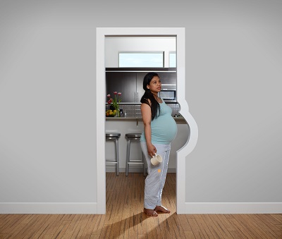When Zwick began having her own children her attention turned to maternity. She mused on the public nature of the pregnant body in “Hello 2,” in which her fully impregnated belly is presented out of context, projecting proudly from a vibrantly patterned fabric scrim. She elaborated on the piece in the recent exhibition “Kids/No Kids” at The Factory by adding a mesmerizingly rotating belly button, a madcap illustration of the absurd changes a pregnant body undergoes.