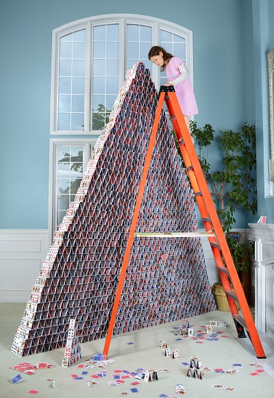Zwick investigated her own childhood memories and fantasies in the 2017 “Constructed Narrative” photo series. She built fanciful life-size environments such as an open-air bedroom in the woods, an 11-foot-tall house of cards, and a doorway altered to give wide berth to a pregnant belly. She populated these tableaus with girls who stand in for her own adventurous younger self. The result is a series of images that are hyper-real, anxious and fantastical, like the wanderings of a child’s imagination.