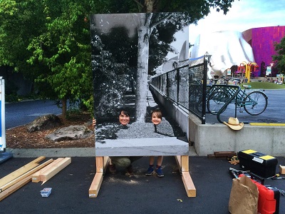 For her 2015 “Playful Photo Opportunity” series, Zwick printed out life-sized reproductions of everyday scenery and installed them at their original locations with face holes for viewers to poke their heads out, creating a ridiculous photo opp that looks Photoshopped but is, in fact, real. In the “Head Sets” series the concept took on three dimensions, and viewers were invited to insert their heads into tiny replicas of a living room and a gallery in the Frye Art Museum. She set up these works at outdoor art festivals, where they were major crowd-pleasers both for kids and their grownups, successfully creating a “little tiny hiccup” in mundane reality.