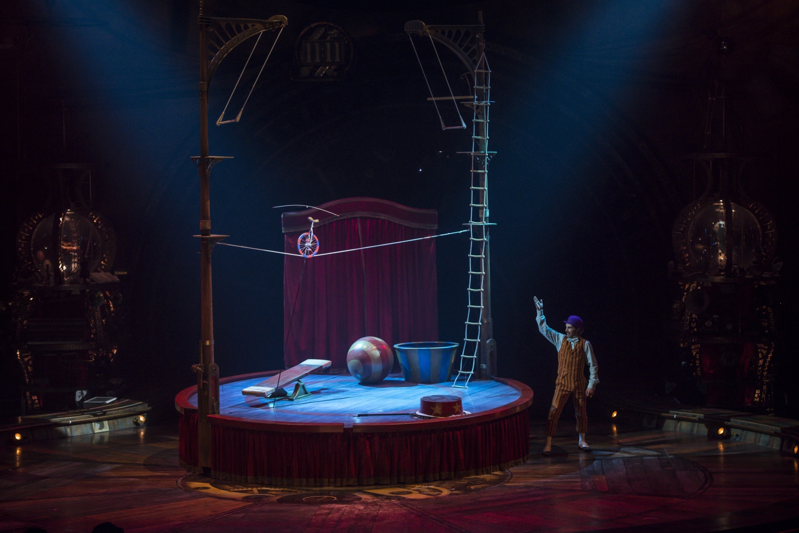 There’s plenty of time to take in the intricacies of this world before a life-sized locomotive eases onto the stage and a group of eccentrics and performers in steampunk costumes – the “Curiosistanians” – disembark to introduce the Seeker to a world beyond his imagination. Strangely, it’s not the mechanical wonders but the wonders of the human body that inspire us, the Watchers.