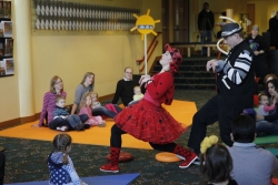 The SCT lobby is the auditorium and stage for this production. Seating is simple as the audience is ushered onto four large mats dissected by two aisles. Kids will love that they can choose their favorite color to sit upon. Parents will love that there is not a bad seat in the house. (Keep in mind you are sitting on the floor, so dress accordingly.) The actors use the aisles in between the mats and much of the periphery, which keeps even the littlest child engaged in the action. With a few props, large movements and a little physical comedy, opposite concepts such as in and out, up and down, round and straight become fun and easy to understand.