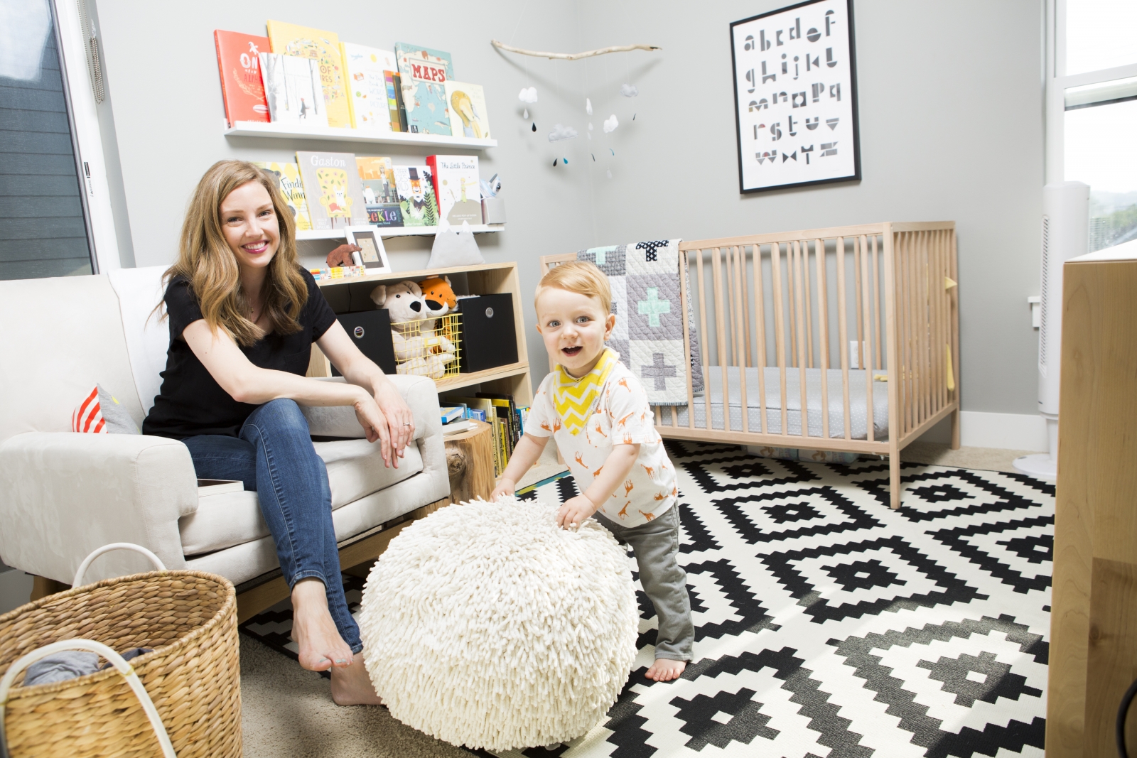 With the arrival of Henry, Kate and Chad knew they wanted a comfortable nursery in which the whole family could enjoy spending time. Kate, a part-time elementary school librarian, wanted to make sure there would be lots of room for books—even building the shelves out of pine board herself, so they’d be just right. She added another handmade touch with a mobile she made from driftwood and felt, coupled with a cozy chair and mini library perfectly conducive to reading: “Chad and I are both always saying how happy, bright and comfortable the room is, even with its small footprint.”