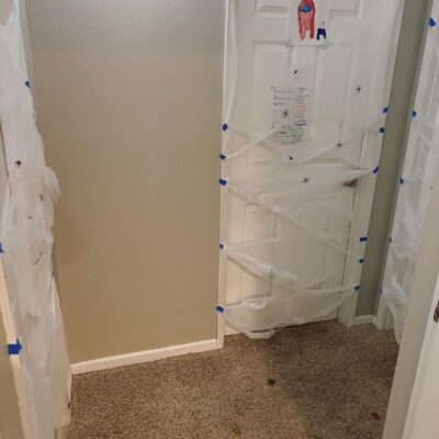 If your kids can handle a bit of spooky, fake bugs, snakes, and other critters, you can use them in a number of ways to catch them off guard and give them a sigh of relief when they realize it’s all a joke. Dig into your Halloween decorations and pull out some cotton spider web decorations to adorn spaces in your home. I like adding them to my kids’ bedroom doors so they are greeted with a spooky surprise in the morning.