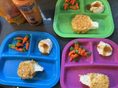 When dinner rolls around, prepare a faux feast. Vanilla ice cream with caramel sauce can pose as mashed potatoes, and candy peas and carrots make a perfect side dish (you may even find Easter candy that looks like carrots at this time of year). For the main course, you can serve meatloaf “cupcakes” topped with mashed potato “frosting,” or try your hand at making these ice cream “fried-chicken” look-a-likes.