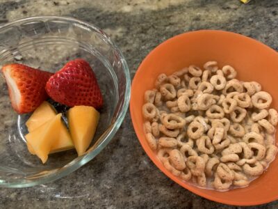 Plan to start the day with a hearty (har har) breakfast the night before. Make juice-colored Jell-O in kid-sized cups and freeze a bowl of cereal with milk. Kids will get a kick out of trying to eat their difficult-to-consume breakfast before you bring out the real deal.
