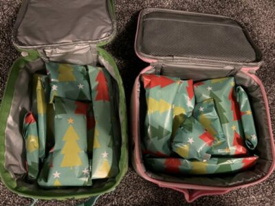 Pack your kids’ lunch with a special touch by wrapping individual items in paper. For an added laugh, use holiday paper that is out of season.