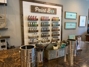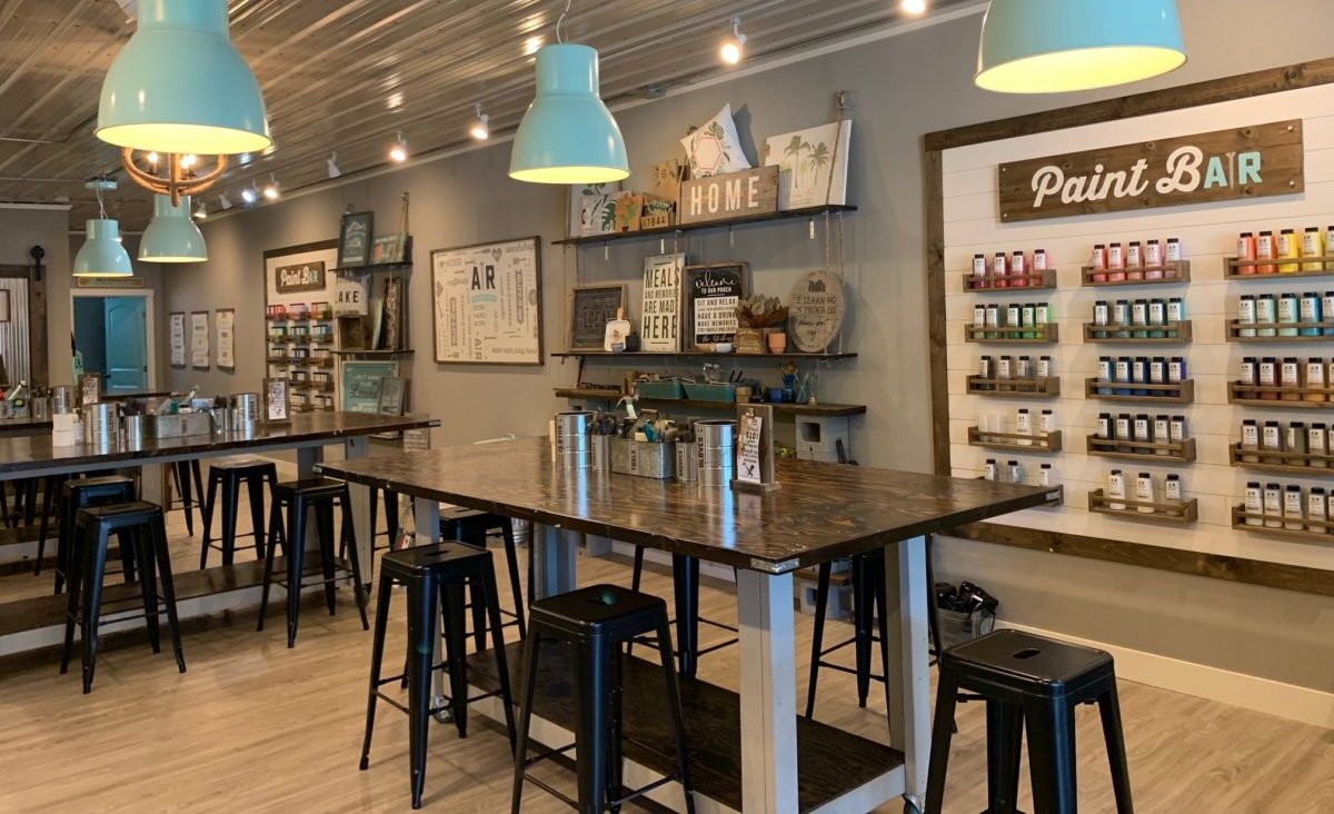 The options for projects are almost limitless. For example, wooden signs, fabric totes and pillows and marbleized resin art. In addition, the materials are kid-friendly: natural, plant-derived wood stains and low-VOC paints. The shop displays examples of finished projects, many of which are under $50.