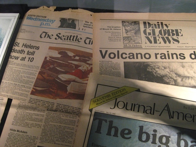 More memories will come back to you as you read the headlines of the newspapers on display from the day of the eruption. My son pointed out that one newspaper also proclaimed the opening of the new Star Wars movie. Interesting items, such as a nylon jacket destroyed by hot rocks that had fallen from the ash dome and a mangled Weyerhaeuser truck door crushed in a mud flow and avalanche, grabbed our attention. After viewing a huge tree stump that had been blasted by the eruption, my son exclaimed, “I can’t believe they have all this cool stuff!”