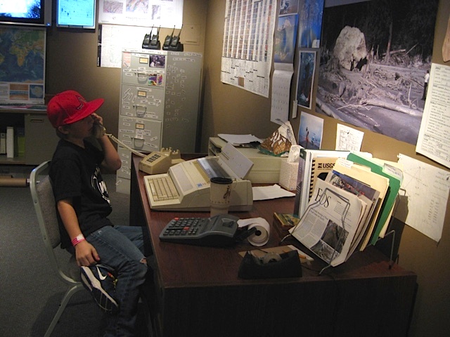 Moving on to the next room, we learned our word of the day: volcanology. And we found ourselves in a replica of a 1980s U.S. Geological Survey lab, complete with lockers stuffed with geologist’s clothing and lab coats. Children can pretend they are scientists, using real scientific gear. There is a desk where you can sit and pretend to use an “old-fashioned” telephone, an electric typewriter and other scientific equipment. One of the most interesting objects in this room is a “spider,” a piece of seismic monitoring equipment that is on loan to the museum, and will need to be put to use if a volcano shows any signs of a quake.