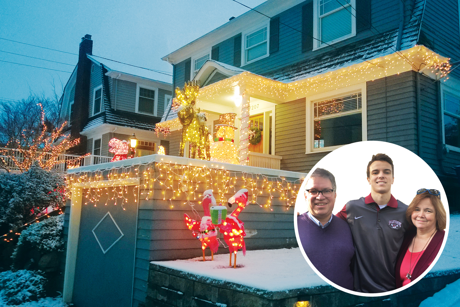 Since then, the Kleisle-Murphy light display on Seattle’s Queen Anne Hill has kept growing. The original deer expired, but they’ve added a light-up moose, a couple of replacement deer, a dozen candy canes, a snowman, two flamingos, a small hippo, a 6-foot-tall Abominable Snowman riding a moose and eight dolphins, plus lights in the trees and on the house. Getting dolphins instead of reindeer was Isaac’s idea, Laura says, and she went with it because “you’re happy your teenage boy is participating.”
