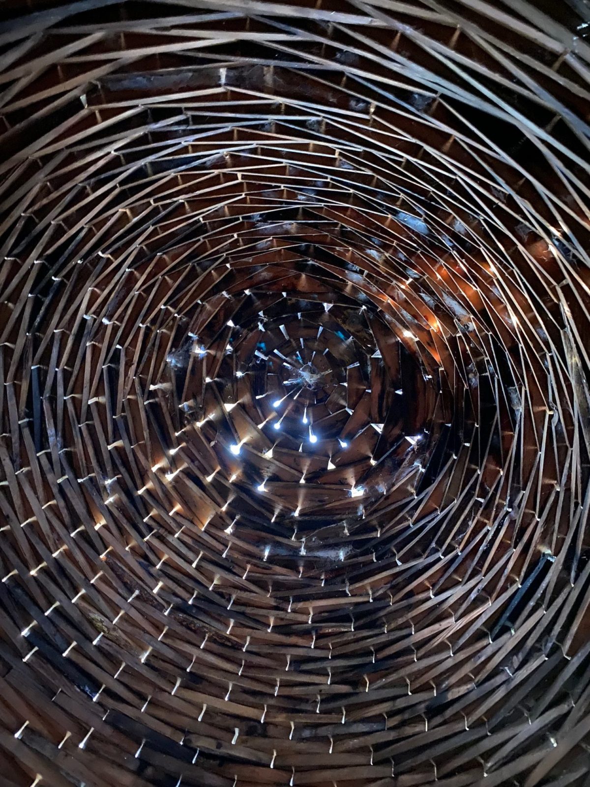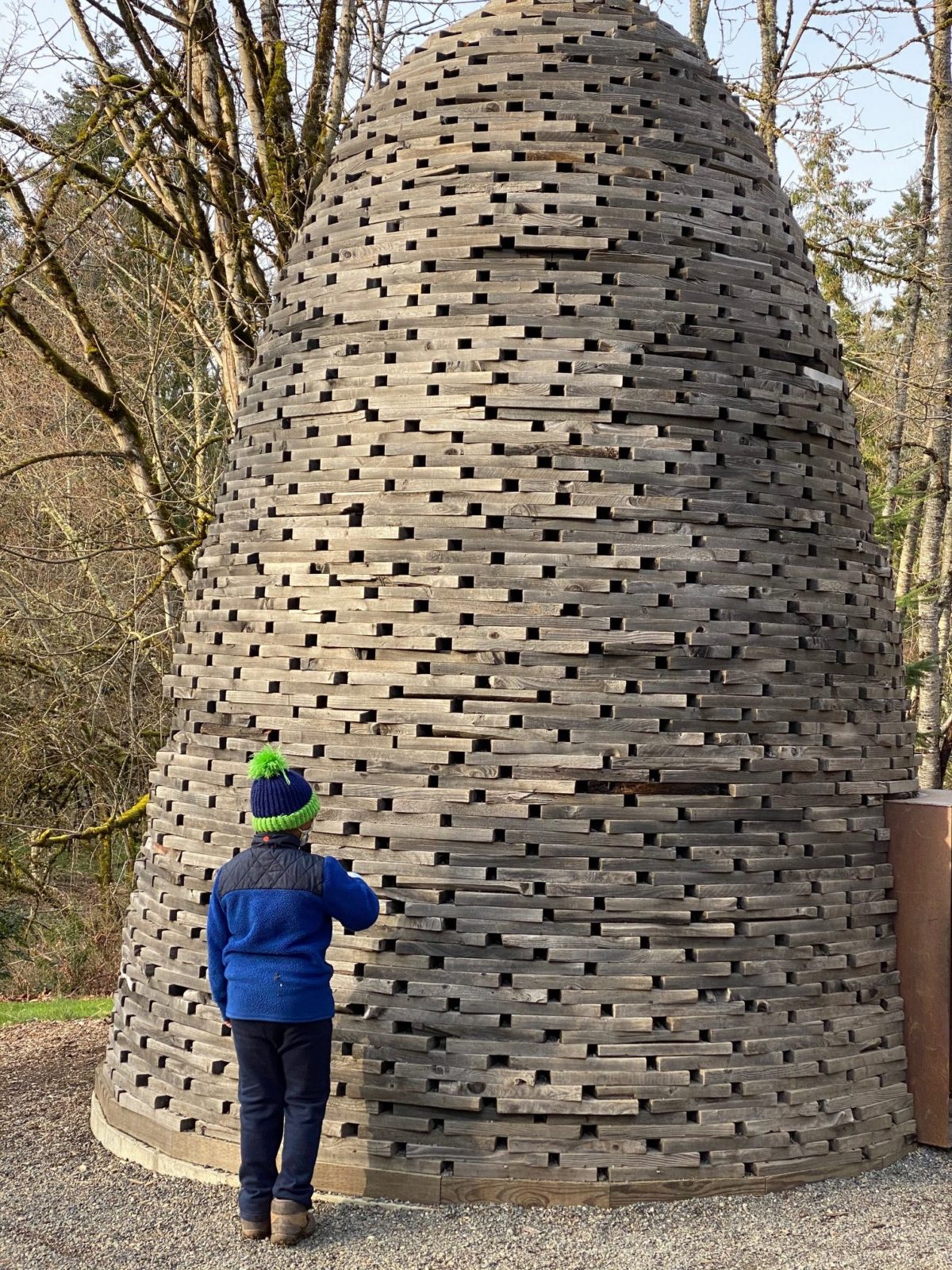 The trail is a 1/3-mile loop through ten acres of woodlands, meadows and wetlands. We spot birds and squirrels, balance our way back and forth on moss-covered stone garden hedges, and see many sculptures. There are many favorite sculptures – one in particular is “Night Blooming,” a structure resembling a beehive with an opening so visitors can check out the inside. My kids pretend to be bees and buzz ourselves into the sculpture and find the afternoon light passing through the tiny gaps, creating a remarkable image. We stay a while, sitting on the ground, just looking up.