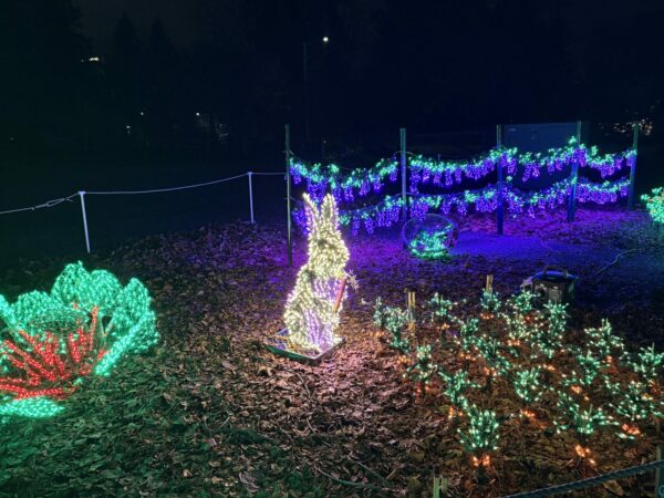 During our walk through this year’s light show, several displays stood out: a scintillating river, a life-size vegetable garden (complete with a sneaky rabbit pulling up carrots!), and even a fire-breathing dragon. Each light sculpture plant is created by hand, taking anywhere from 2 hours for a small flower to over 40 hours for a larger and more intricate plant. The largest light sculpture currently on display is the poinsettia tree that is composed of over 11,000 lights and took over 350 volunteer hours to create.