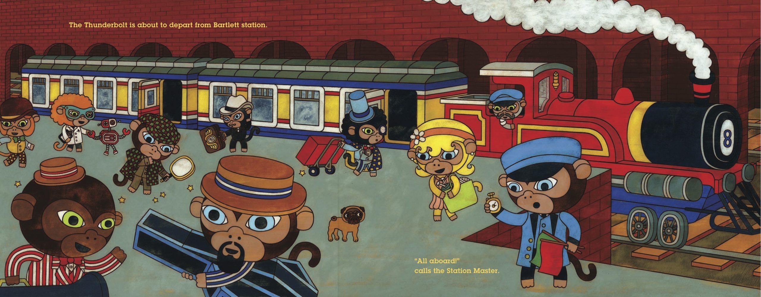 He happily sat in my lap and opened the cover to reveal illustrations that are simultaneously vibrant, detailed and playful. It is evident from page one that Matthew Porter is an accomplished artist. Lured in by the illustrations, we jumped aboard the Thunderbolt Express with Mayday the detective, Oscar the magician and Jango Jenkins and his Dixieland Band, all monkeys donning fabulous outfits complete with bowties and bolo hats.