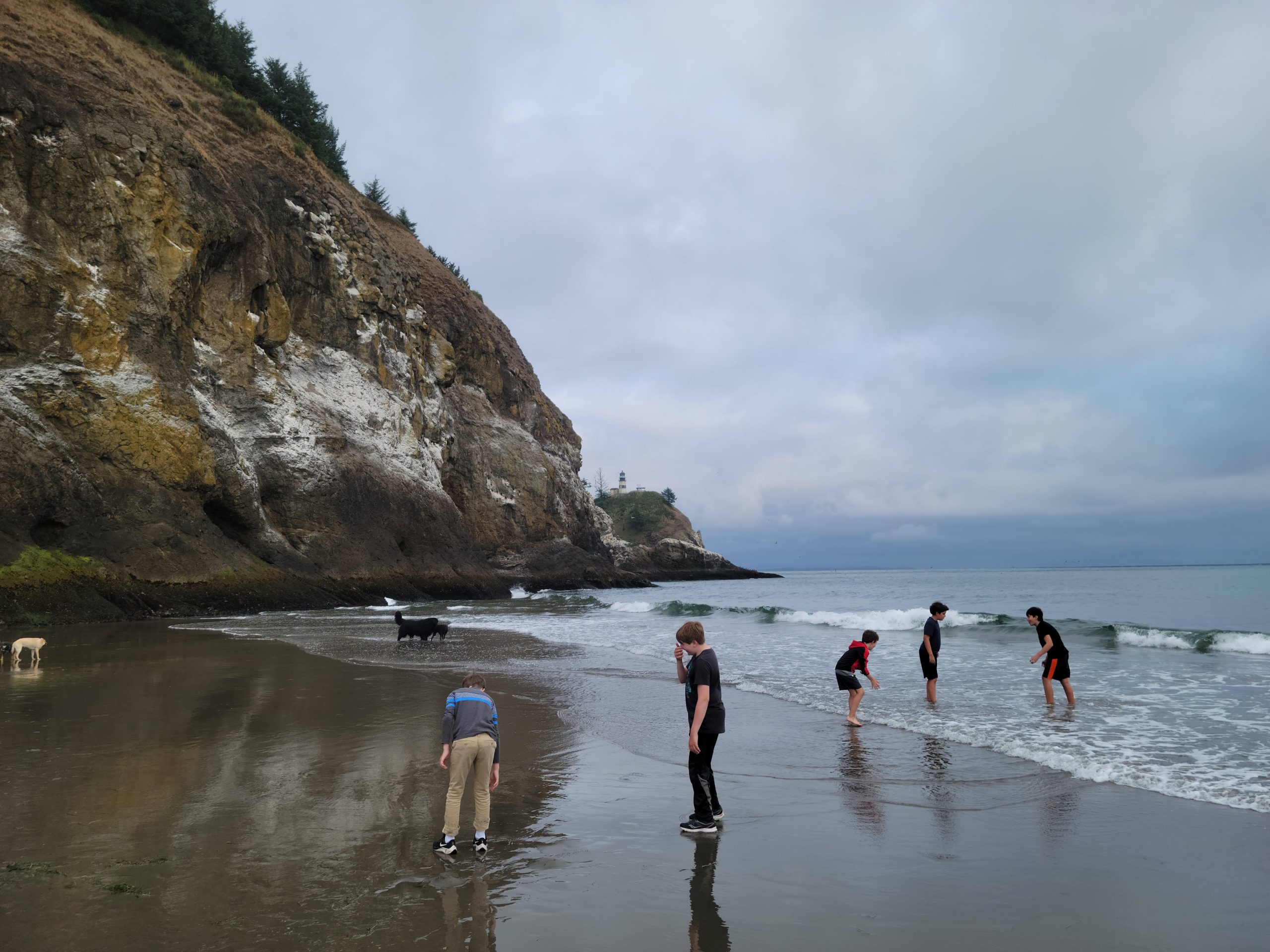 The many boys on this group camping trip had a great time running over to the ocean to scamper around and play — sometimes with large, friendly, well-behaved dogs who were romping about. The popular beach is nestled among cliffs, right under the stunning Cape Disappointment lighthouse. (Meanwhile, the older boys, teenagers, had a great time buying six-dollar packages of Oreos at the nearby campsite store. It also offers camping supplies such as ice, wood and fishing gear, as well as vacationing teen essentials such as Cheetos, queso and soda.)