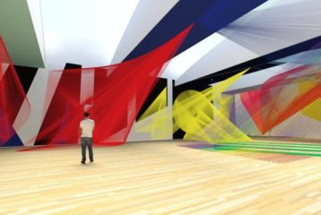 Color and texture intersect in Pae White's art installation.