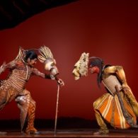 Massive elephant and rhino puppets, actors visible beneath their animal visages, lumber down the aisles.