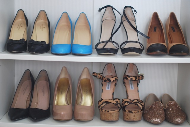 There are a multitude of options that allow your shoes to have their own space, without cramming each other's toe-space. Whether individual cubbies, shelves or (my personal favorite) a towel bar installed on the end wall inside a closet to tuck all those pairs behind, any of these will give your shoes a space of their own.
