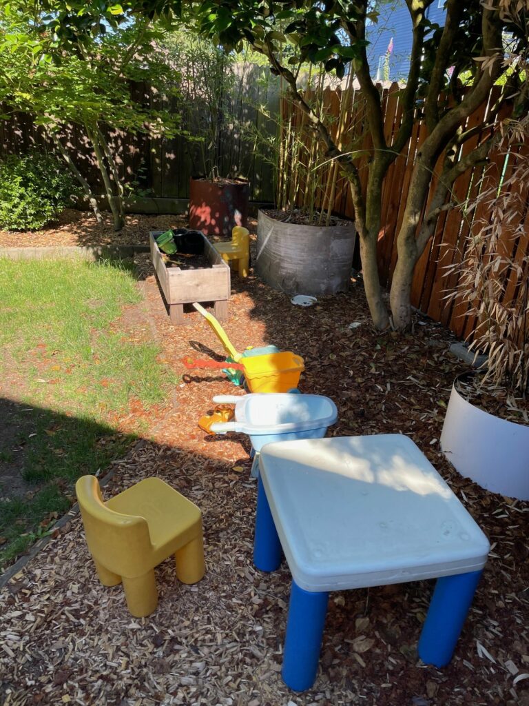 It was the end of the summer and starting to cool down. I found a water table listed in our local Buy Nothing group and jumped at the offer. For most of the fall, winter and spring, the water table was filled with our outdoor plastic balls and infrequently used, but now that the sun has come out again, it’s become a favorite backyard activity.