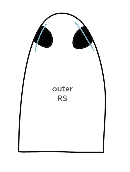 - Make the ears. Sew the two sets of ears right sides together with a 1⁄4-inch seam allowance. Turn right side out, press, and baste onto the right side of one of the outer pieces.