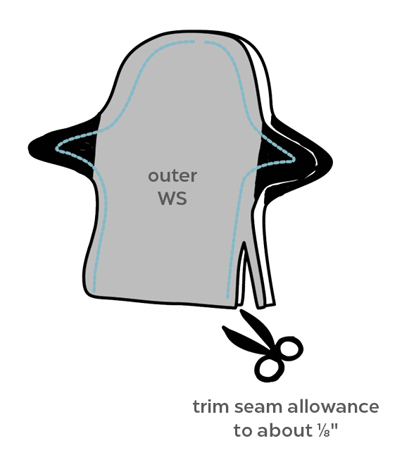 - Sew the outer puppet pieces right sides together with a 1⁄4-inch seam allowance. Trim the seam allowance to approximately 1/8 inch, turn the garment right side out, and press.