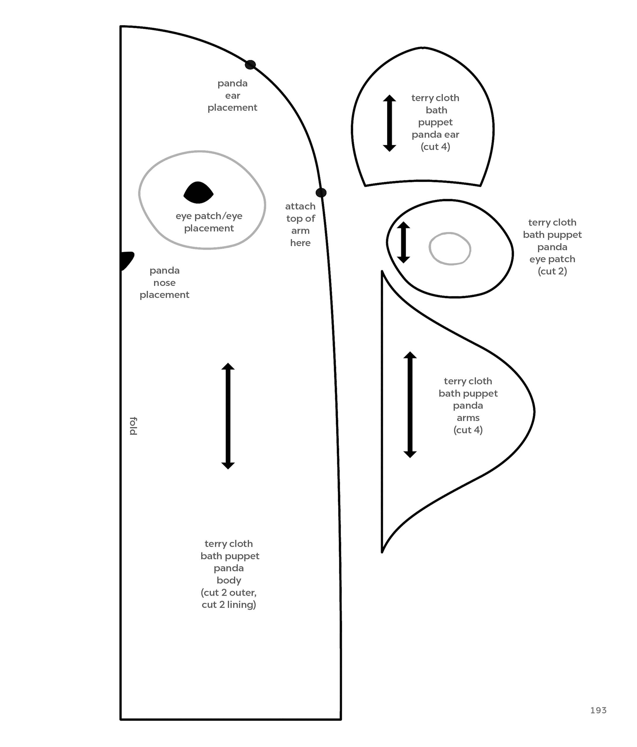 - Trace the templates for the panda body, lining, eyes, ears, and arms onto the appropriate fabrics and cut out all the pieces.