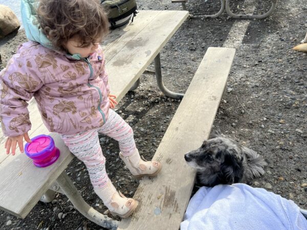 For this reason, I tend to keep an eye on the dogs coming our way. Is there a rambunctious puppy that has been up on its hind legs with the visitors ahead of us? Does that dog with the zoomies look like it might be headed to us next? If so, I invite my kids to either take a break in the stroller or walk alongside me so that I may help temper the blow or calm the approaching dog.