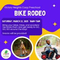 Victory Heights Cooperative Preschool is hosting a bike rodeo. Bring your bikes, trikes, and scooters