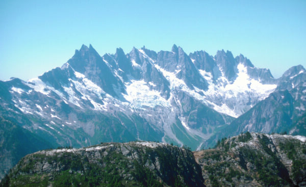 North Cascades National Park is a vast mountain wilderness filled with glaciers, lakes, and conifers located in the northwest corner of Washington State, bordering the Canadian border.  It offers spectacular, rugged beauty characterized by jagged peaks, deep forested valleys, cascading waterfalls, and over 300 glaciers — more than in any other U.S. park outside of Alaska. The park is managed with nearby Ross Lake and Lake Chelan National Recreation Areas.
