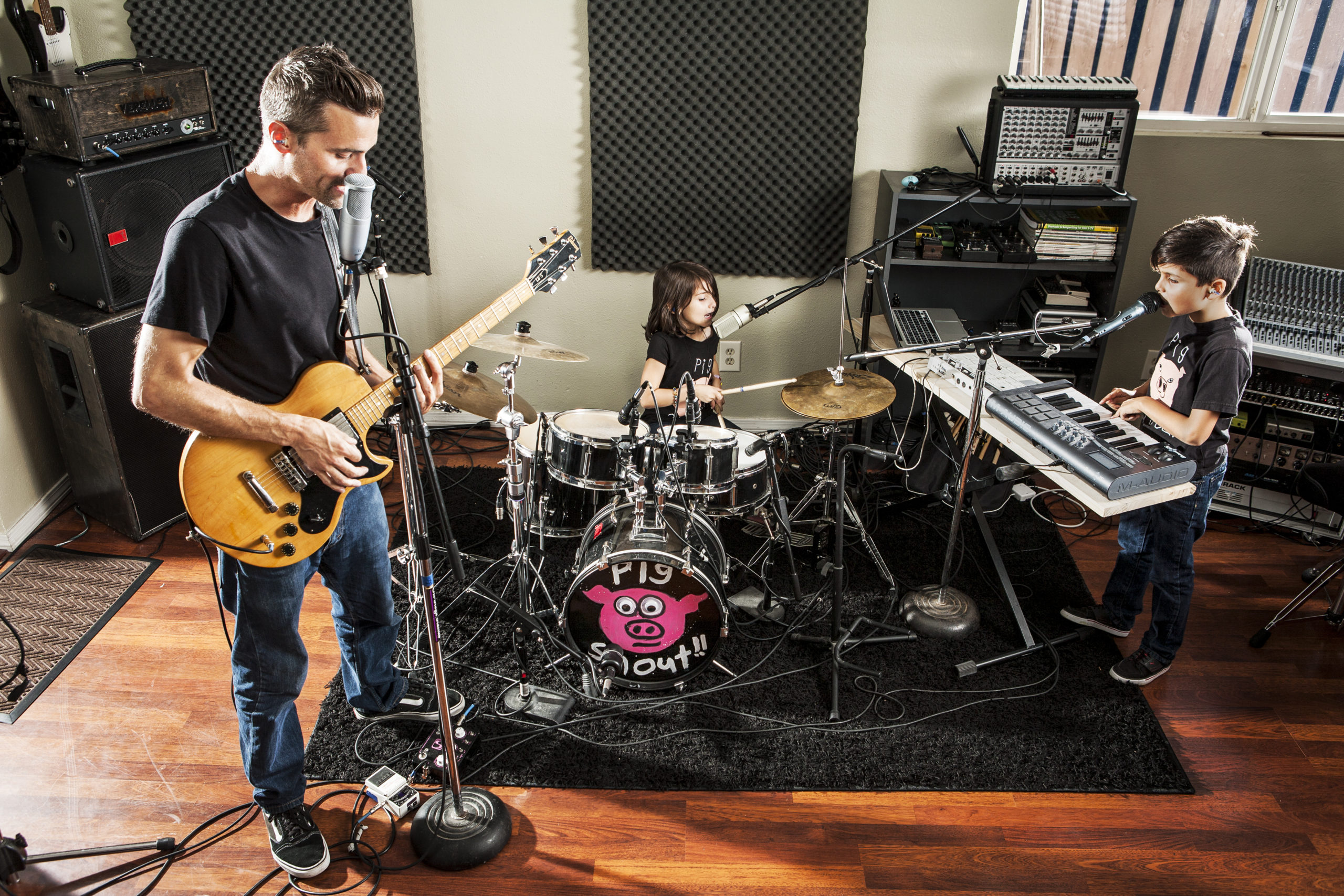 Justin has a unique approach to music lessons: when he's teaching a student how to play drums, he gets them playing a beat, and then accompanies them on the guitar. For guitar students, he teaches riffs and bar chords, then plays the drums along with students so they can feel what it's like to work with other musicians. Using this approach with his two kids, a band came together quickly.
