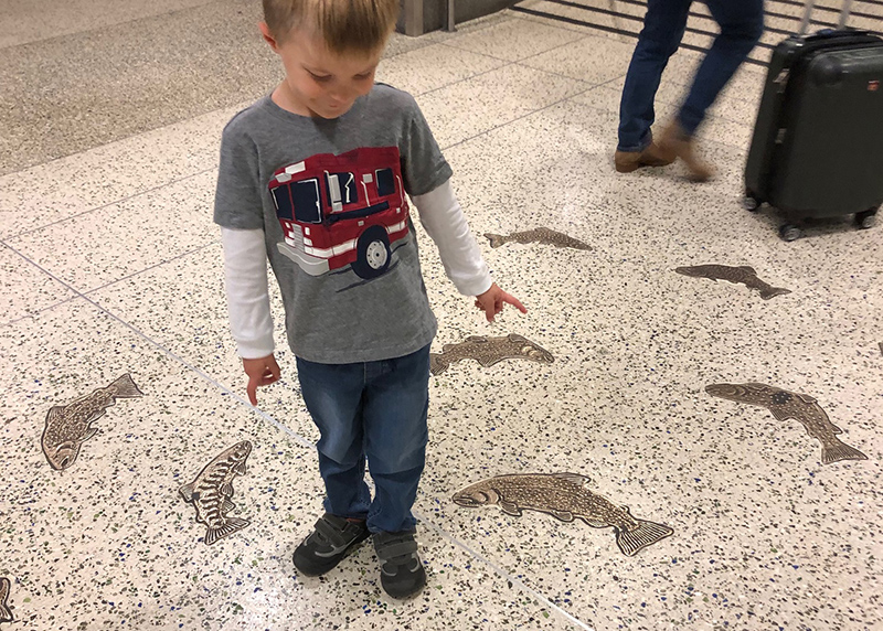 Wiggles multiply when traveling, so it’s important to shake out as many as possible before everyone is confined to a plane seat. Before boarding, make sure to swing by the free children’s play area between the central terminal and A gates. On your way, try to see how many “flying fish” you can spot on the floor. Encourage your kiddos to find the ones carrying suitcases for an extra challenge.