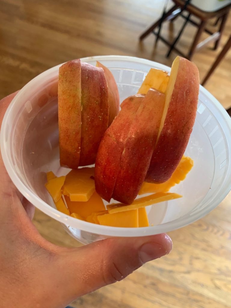 Our go-to snack is sliced apples and cheese. It takes only a few minutes to prepare, and always tastes delicious at the park.