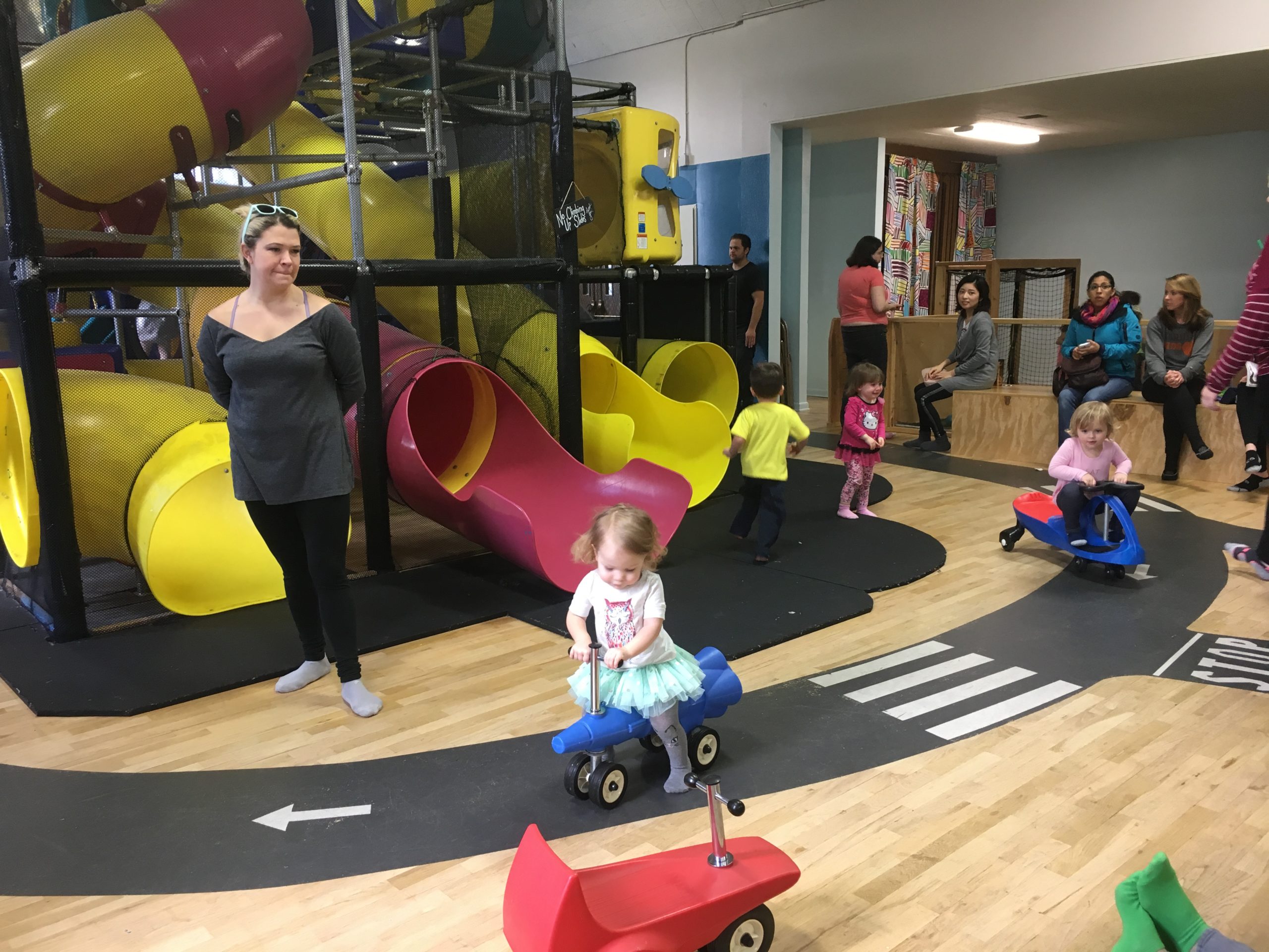 Our other favorite feature was the road on the floor that goes around the play structure. Kids on trikes and other riding toys seem to love pretending they’re out on the open roads of Seattle. There is also a toddler-only area for kids under 2 years old, with colorful patterned pillows and rocking chairs in addition to the wooden benches. Little behinds and knees will appreciate the soft padded floor and the giant foam blocks. You’ll also find blocks, stacking cups and other infant-friendly toys.
