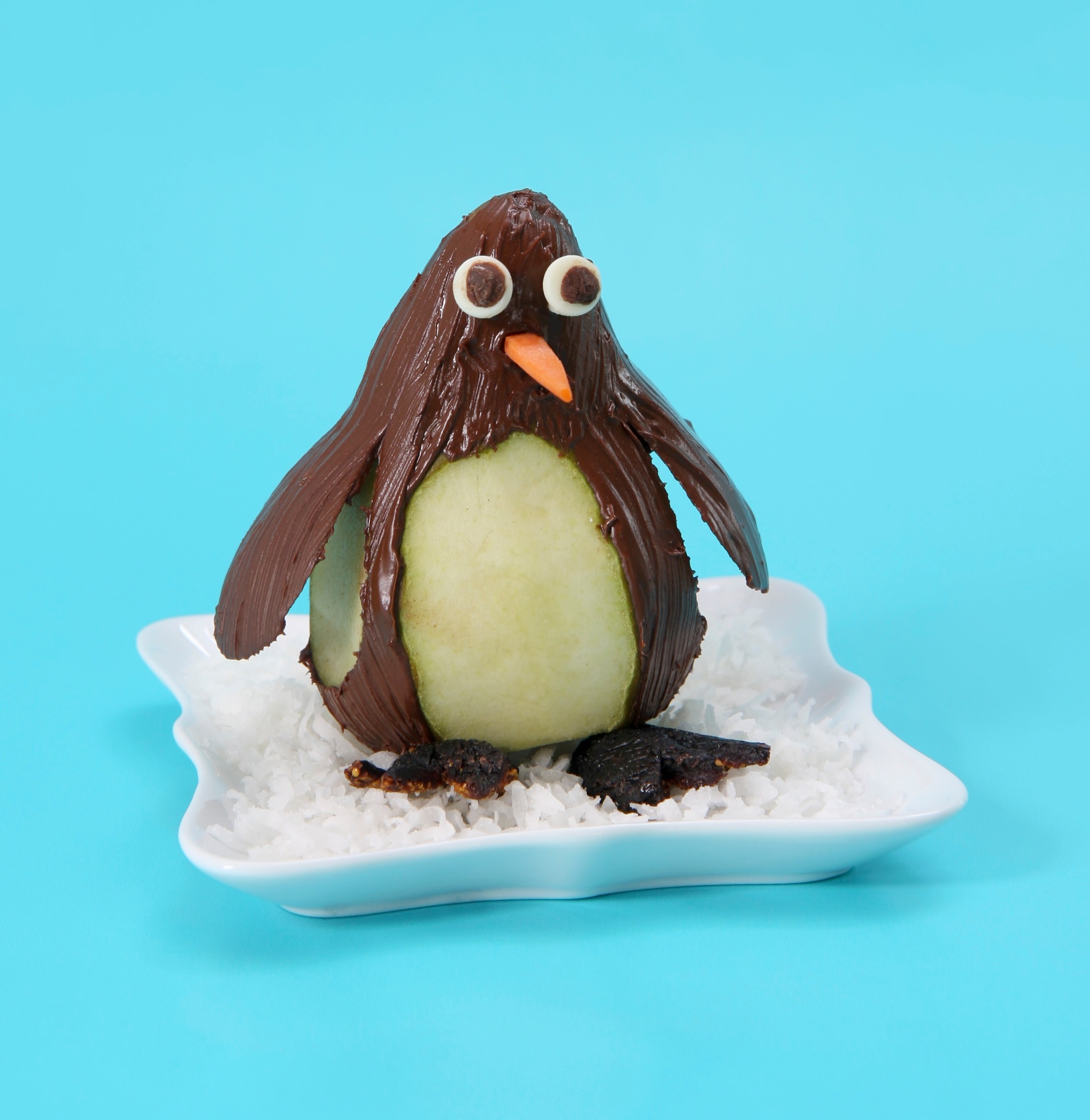 3. Use a pastry brush to paint chocolate on the penguin's body, everywhere but his stomach and the undersides of his wings. Use a toothpick to notch a spot for each of the chocolate-chip eyes and the carrot beak. Insert the eyes and carrot beak. Balance the pear penguin on a plate and place the fig halves for feet. Sprinkle coconut around, like it's winter at the North Pole. Dress up in black and white clothes for this frosty feast!