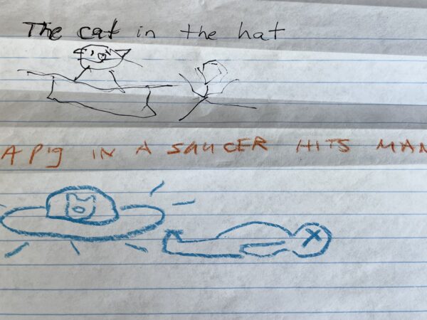 - Take turns reading allowed and showing drawings where each phrase started and where it ended. We howl like wolves as papers are read and delight in the creativity of our family members.