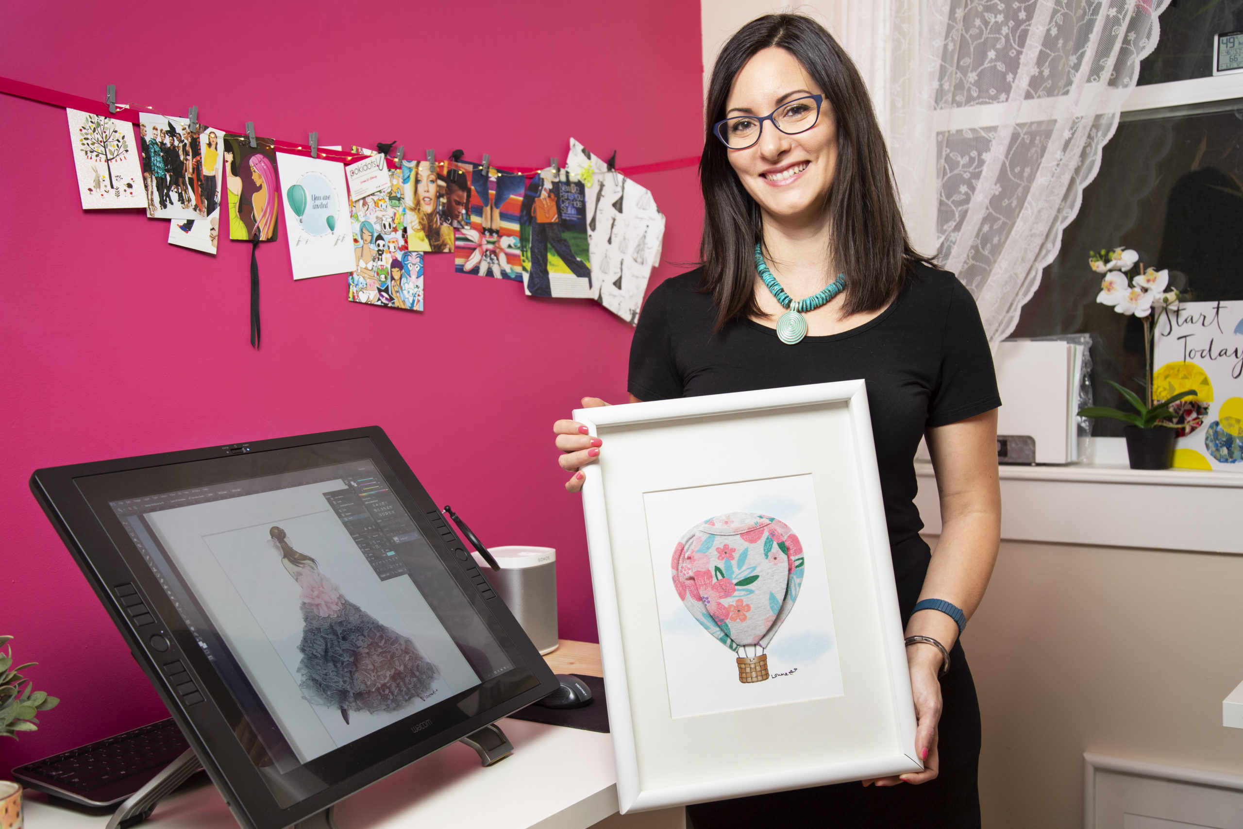Customers have chosen an illustration of a young woman, a sailboat, or a hot-air balloon to showcase the baby clothes in the form of dresses, sails or balloon folds. Many of her clients have told her that the beautiful keepsakes make it easier to part with the rest of their children’s baby clothes and donate them to other families. This repurposing makes for a practical and meaningful addition to her work.