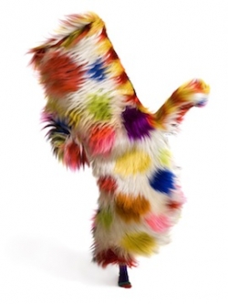 In the midst of another platform of fake fur suits in eye-popping colors is a figure made of lumpy leggings with a bright copper-wire head festooned with human hair. Cave and the show's curator, Pamela McClusky, say the pieces ask the viewer, "What happens when you are at a masquerade event and no one can see your full face? What happens when you're disguised so much that no one knows your race or sex?"