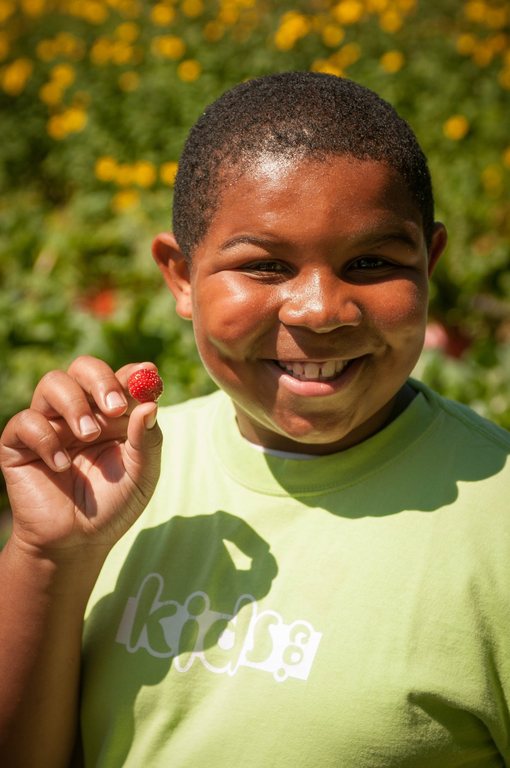 It continues with picking sweet, sun-warmed strawberries, blueberries and blackberries straight from the plants, nibbling unfamiliar leaves like stevia and sorrel, asking where more strawberry plants come from and why cabbage leaves have a white coating on them, and how you can tell when a worm is pregnant.