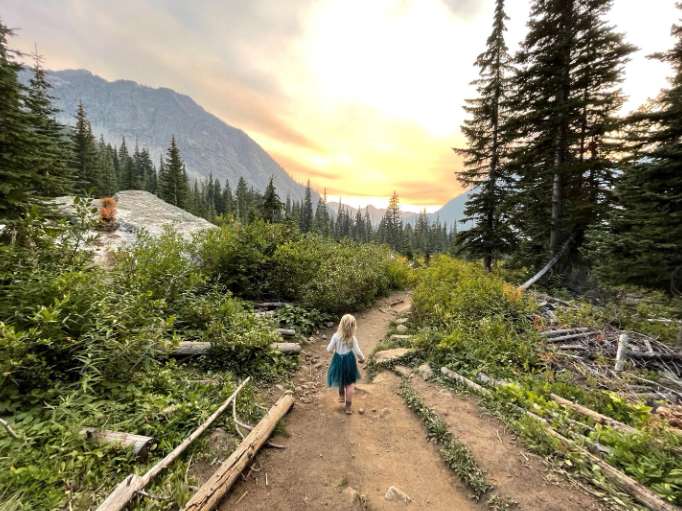 The trail leading to Rainy Lake is wheelchair-accessible and great for strollers. It is paved the entire way to the lake. Just a short jaunt from the trailhead for Heather-Maple Pass, the trail leads to a glistening blue lake with lofty mountain views. Along the trail are benches perfect for relaxing breaks for your littlest adventurers. A small, wooden platform is erected at the end of the trail – a beautiful place to take in the serene landscape. The larches can’t be seen up close, but when you look up there are a beautiful site to see in the alpine.