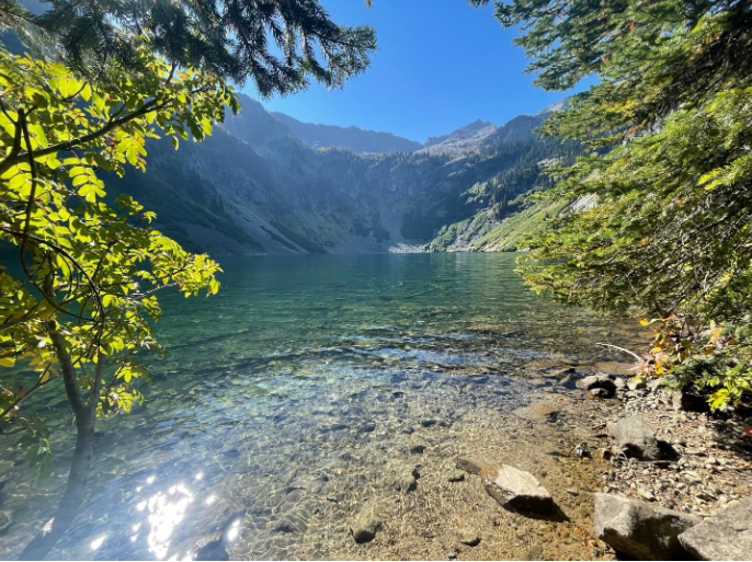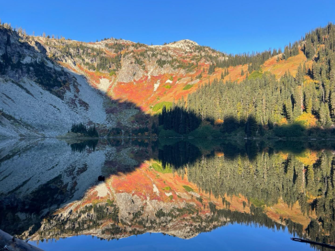 Lake Ann, like many other hikes on this list, is accessed at Rainy Pass. To get to the lake, start at the trailhead for Heather – Maple Pass Loop. Make sure to go counterclockwise, or you’ll be hiking a very long time until you get to the junction for Lake Ann. The trail begins with switchbacks through dense forests before opening into a beautiful valley surrounded by a kaleidoscope of fall foliage. Continue a little farther and you’ll see the turn off for Lake Ann. The trail runs parallel to the Heather – Maple Pass Loop trail, which continues up toward the ridgeline. The Lake Ann trail heads straight toward a gorgeous glacial lake where driftwood converges on the shore and golden larches encircle the calm water. Above the lake is the expansive ridgeline of Heather – Maple Pass. In fall, colors of autumn blanket the steep mountainside.Â