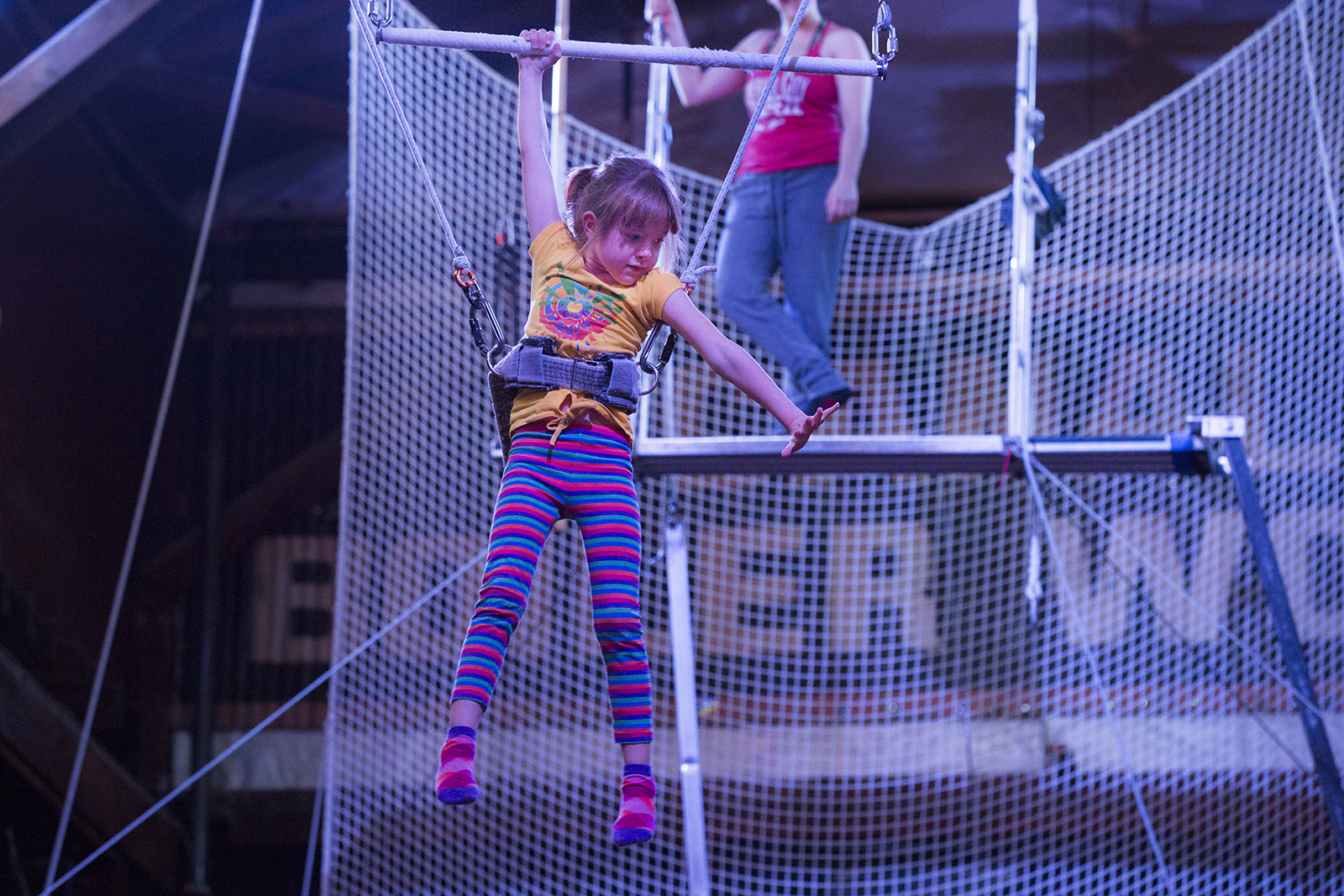 Kids, wearing a harness operated by staff on the ground, learn moves like the Superman and the monkey. As they leave the high platform grabbing the thick bar in two hands, squeals of delight echo around the room, morphing into exhilarated sighs as they gently drop into the net below. The adrenaline is practically visible as kids race to the ladder to try again. Something about the flying, flipping and flopping is addictive, and with each turn kids will learn, improve and want to do more.