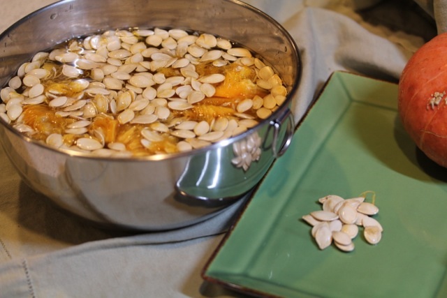 Place the pumpkin pulp and seeds in a large bowl or sink full of water. Simply squeeze the seeds off the pulp. They will float to the top. Scoop them out onto a cookie sheet or baking pan.