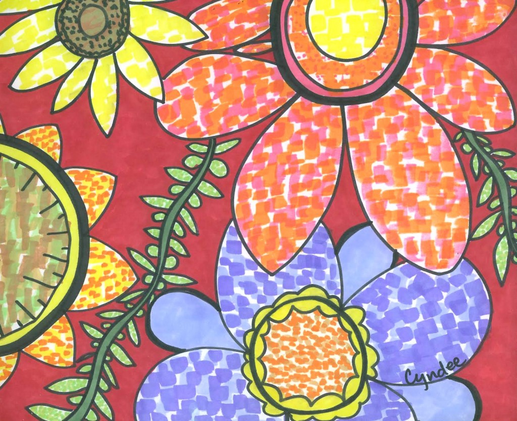 4. Look at your drawing and think of extra details you want to add now that your flowers are there. Do you want extra designs or lines inside your circles? Would a second row of petals fit on one of your flowers? If you have a big empty space in your background, try filling it in with a wiggly vine and leaves or some fun shapes. If you have an extra-thick black permanent pen, you can choose some lines to trace over and make bolder for decoration.